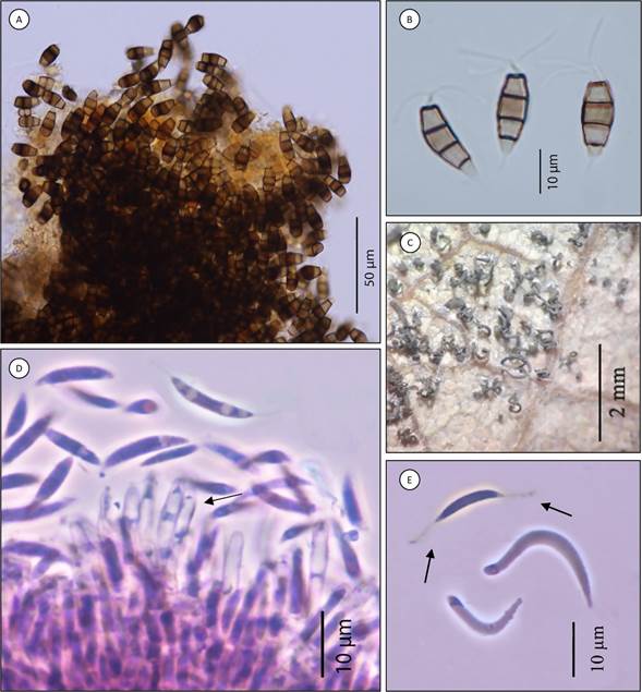 Notas taxonómicas: los promedios de las dimensiones del largo y ancho de los conidios estudiados están en los rangos del ejemplar tipo ((34)38-61(67) × 19-72 μm). Cabe mencionar que se detectó un par de conidios cuyo largo (73.4 y 68.4 μm) rebasa el máximo reportado por Hashimoto et al. (2016), por lo que con los datos recabados se amplía el rango de las medidas de los conidios de la especie.