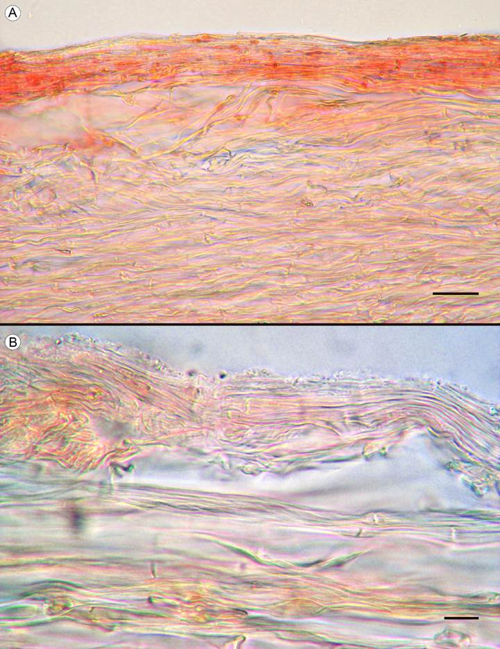 Figure 4: Tricholoma mesoamericanum & Cifuentes pileipellis. A. E. César 131 (XAL); B. L Montoya 4769 (XAL). Bars: 25 µm.