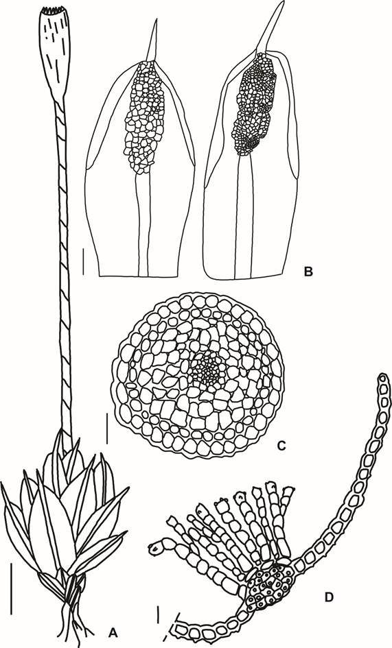 Figure 2: Crossidium geheebii (Broth.) Broth. A. habit; B. leaves; C. cross section of stem; D. cross section of leaf. Scale bar: A=1 mm, B=100 µm, C=100 µm, D=10 µm.