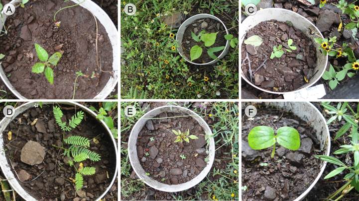 Figura 3: Plántulas: A. Amphipterygium adstringens (Schltdl.) Standl.;B. Ipomoea pauciflora M. Martens & Galeotti; C. Haematoxylum brasiletto H. Karst.; D. Senegalia macilenta (Rose) Britton & Rose; E. Spondias purpurea L.; F. Jacaratia mexicana A. DC. Fotos: Alondra Nicolás Medina.