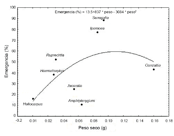 Nuestra predicción de que las especies sucesionales tardías tendrían mayor emergencia que las tempranas no se cumplió. Dado que los porcentajes de emergencia presentaron una alta variación dentro de los grupos sucesionales, a continuación, discutimos que esta variación pudo deberse al tamaño de las semillas de las especies seleccionadas para este estudio; en la literatura encontramos evidencia que apunta a que las especies tardías podrían presentar mayor emergencia debido a sus semillas más grandes (Camargo et al., 2002; Daws et al., 2005; Meli et al., 2018). Por ejemplo, en un estudio de siembra directa en Brasil, dos especies de leguminosas sucesionales tardías (clímax exigente em luz, en el original en portugués sensuOliveira-Filho et al., 1995) con semillas grandes, Cassia grandis L. f. (0.75 g) e Hymenaea courbaril L. (4.99 g), presentaron el doble de emergencia (60%) que la no-leguminosa Schinus terebinthifolia Raddi (Anacardiaceae; 35% de emergencia) que es una especie sucesional temprana con semilla más pequeña (0.13 g; Ferreira et al., 2009). En promedio, las especies sucesionales tempranas tienen semillas más pequeñas que las tardías (Fenner, 1987). Acorde con esto, en este estudio, tres de las cuatro especies sucesionales tempranas (Senegalia macilenta, Heliocarpus pallidus e Ipomoea pauciflora) tuvieron, en promedio, semillas de 0.060 g mientras que las sucesionales tardías tuvieron en promedio, semillas de 0.068 g; la excepción fue la sucesional temprana Spondias purpurea, con una semilla de 0.96 g (Cuadro 1). En El Limón, la especie con el mayor porcentaje de emergencia fue Ipomoea pauciflora, que es una especie temprana con una semilla de 0.090 g. Para Teotlalco, las especies con el mayor porcentaje de emergencia fueron las especies tempranas Ipomoea pauciflora y Senegalia macilenta, esta última con una semilla de 0.094 g. Una revisión acerca de las características de las semillas de las especies de selva estacionalmente seca reveló una relación positiva entre el tamaño de la semilla y el porcentaje de emergencia de las especies debido a que las semillas grandes tienen mayores reservas para estimular la emergencia (Khurana y Singh, 2001). También, un estudio con 12 especies de la selva estacionalmente seca de Brasil con un rango de peso de sus semillas entre 0.007-1.84 g reveló una correlación positiva entre el peso de las semillas y el porcentaje de emergencia cundo las semillas fueron colocadas bajo los pastos (Guarino y Scariot, 2014). En nuestro estudio, tomando en cuenta los datos de las dos localidades, excluyendo a la especie sucesional temprana ya mencionada (Spondias purpurea), se encontró una relación no lineal entre el peso de la semilla (rango de 0.0007-0.16 g; Cuadro 1) y el porcentaje de emergencia (Fig. S1), donde se observa que hay un aumento en el porcentaje de emergencia para las semillas de <0.1 g, mientras que Conzattia multiflora, cuya semilla pesa 0.16 g, tiene un porcentaje de emergencia de 43% (Fig. S1). Acorde con nuestros resultados, en un estudio en la sabana brasileña con 12 especies cuyo peso de semilla va de 0.23 a 4.85 g, también hubo una relación no lineal entre el tamaño de la semilla y el porcentaje de emergencia cuando estas especies se sembraron en áreas sin cobertura vegetal; en ese estudio se observó un aumento en el porcentaje de emergencia para las semillas de <3 g y después de ese tamaño, el porcentaje de emergencia disminuyó (Cuadro 1 en Silva et al., 2015). Así, en este estudio, para las especies con semillas de hasta 0.1 g, el tamaño de las semillas fue un mejor predictor del porcentaje de emergencia que el estatus sucesional; otros factores extrínsecos, como el microhábitat donde se siembran las semillas, también juega un papel importante.