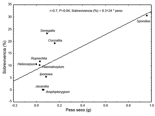 Para todas las especies se calculó un índice de éxito, entendida como la proporción de semillas que emergieron y que sobrevivieron después de un año (proporción de emergencia × proporción de sobrevivencia/100). Este índice de éxito nos permite evaluar si existe un compromiso entre estos dos componentes del desempeño de las especies y está basado en la ecuación establecida por De Steven (1991).