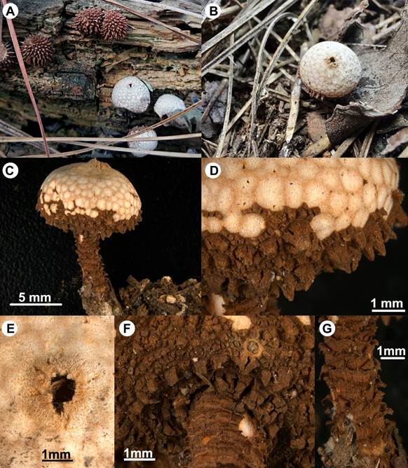 Figura 1: Tulostoma exasperatum Mont. A-B. ejemplares in situ; C. detalle del basidioma; D. verrugas del exoperidio; E. ostiolo; F. cuello; G. estípite.