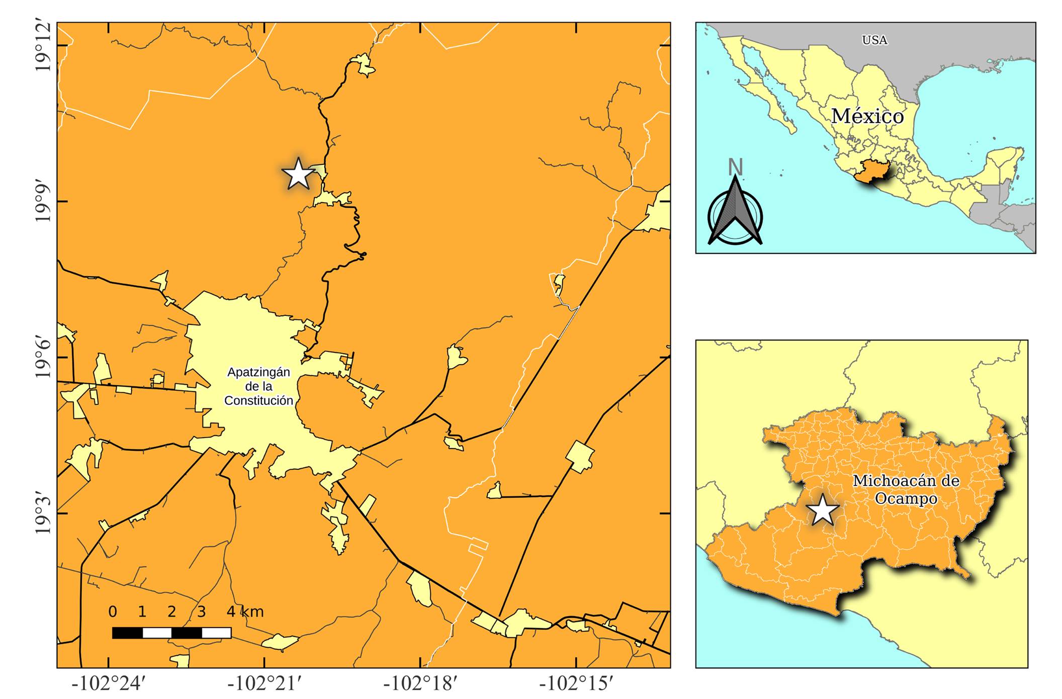El espécimen estudiado se fotografió y recolectó en el rancho “Las Maravillas de Acahuato” en el municipio Apatzingán, Michoacán, México (Fig. 2). El sitio se localiza en 19°09'30.6''N y 102°20'20.4''O, a una elevación de 1112 m s.n.m., con clima cálido y sub-húmedo, con suelos tipo andosol y vegetación subtropical mezclada con pequeños parches de Pinus sp. (INEGI, 2003). De acuerdo con CONAGUA (2023), en Acahuato la temperatura varía entre 16-29 °C con una media de 23 °C, aunque se han registrado temperaturas de hasta 47.5 °C. La precipitación anual es de 1017.5 mm, distribuidas en promedio de 60 días, mientras que la evaporación llega a los 1834.9 mm.