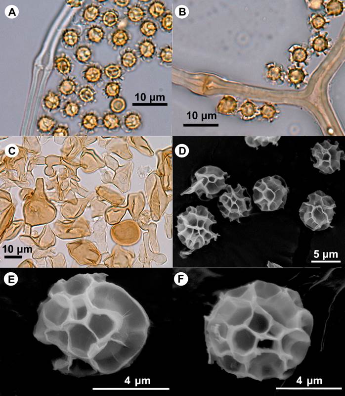 Figura 3: Tulostoma exasperatum Mont. A-B. basidiosporas y capilicio al MO; C. células de las verrugas del exoperidio; D-F. basidiosporas al MEB.