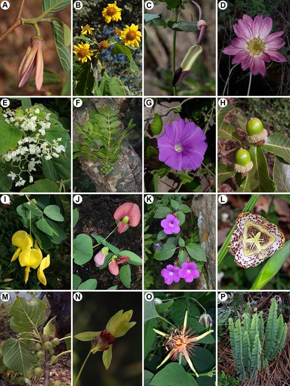 Figura 2: Diversidad de especies de plantas vasculares presentes en La Alberca, municipio Tacámbaro, Michoacán, México. A. Annona longiflora S. Watson; B. Dendroviguiera puruana (Paray) E.E. Schill. & Panero; C. Aristolochia glossa Pfeifer; D. Iostephane heterophylla (Cav.) Benth.; E. Begonia extranea L.B. Sm. & B.G. Schub.; F. Bursera ariensis (Kunth) McVaugh & Rzed.; G. Ipomoea suffulta G. Don; H. Quercus magnoliifolia Née; I. Amicia zygomeris DC.; J. Brongniartia inconstans S. Watson; K. Achimenes patens Benth.; L. Tigridia meleagris (Lindl.) G. Nicholson; M. Ficus petiolaris Kunth; N. Bletia roezlii Rchb. f.; O. Passiflora jorullensis Kunth; P. Adiantum shepherdii Hook. Fotografías: Guadalupe Cornejo-Tenorio y Guillermo-Ibarra Manríquez.