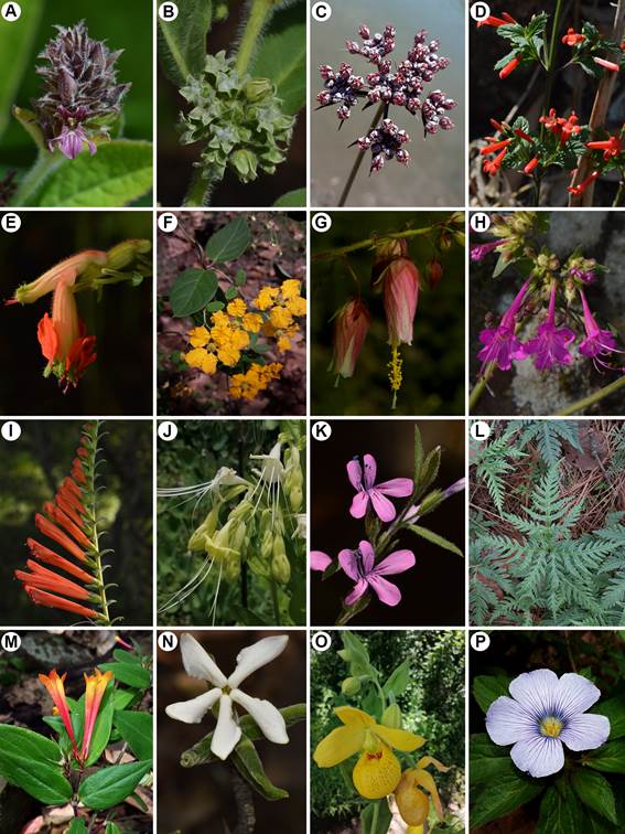 Figura 3: Diversidad de especies de plantas vasculares presentes en La Alberca, municipio Tacámbaro, Michoacán, México. A. Holographis peloria (Leonard) T.F. Daniel; B. Pherotrichis villosa (Schult.) Meisn.; C. Prionosciadium lilacinum Mathias & Constance; D. Russelia leptopoda Lundell; E. Cuphea hookeriana Walp.; F. Gaudichaudia diandra Chodat; G. Kosteletzkya tubiflora (DC.) O. Blanchard & McVaugh; H. Mirabilis sanguinea Heimerl var. sanguinea; I. Lamourouxia rhinanthifolia Kunth; J. Lithospermum exsertum (D. Don) J.I. Cohen; K. Loeselia glandulosa (Cav.) G. Don; L. Bommeria pedata (Sw.) E. Fourn.; M. Bouvardia laevis M. Martens & Galeotti; N. Randia capitata DC.; O. Cypripedium irapeanum Lex.; P. Turnera coerulea DC. Fotografías: Guadalupe Cornejo-Tenorio y Guillermo Ibarra-Manríquez.