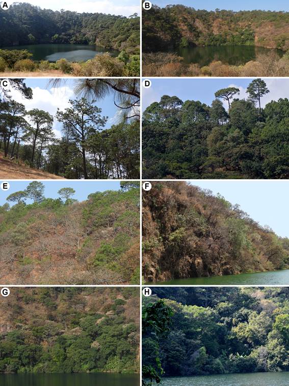 Figura 4: La Alberca, municipio Tacámbaro, Michoacán, México, imágenes panorámicas y de la fisonomía de los tipos de vegetación en diferentes temporadas del año. A, B. vistas del lago cráter; C. bosque de Pinus; D, E. bosque de Pinus-Quercus; F. bosque tropical caducifolio; G, H. bosque tropical subcaducifolio. Fotografías: Guadalupe Cornejo Tenorio y Guillermo Ibarra Manríquez.