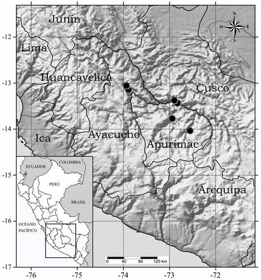 El trabajo de campo se llevó a cabo entre 2016 y 2019 en los departamentos Apurímac y Ayacucho, en el sur de Perú (Fig. 1). Se preparó un ejemplar de herbario de una colecta en el distrito Pichirhua de la provincia de Abancay, departamento de Apurímac (ver Especímenes adicionales examinados), y se depositó en el Herbario del Museo de Historia Natural (USM) de la Universidad Nacional Mayor de San Marcos (acrónimo según Thiers, 2023).