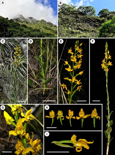 Figura 2: Chloraea multilineolata C. Schweinf. A. vista general del hábitat; B. acercamiento de promontorio rocoso en el que crecen las plantas; C. planta en floración in situ; D. acercamiento del tallo y hojas; E. inflorescencia; F. partes aéreas completas de una planta; G. acercamiento de algunas flores de una inflorescencia; H. variación del tamaño de las flores en una misma inflorescencia, las del ápice (izquierda) de menor tamaño; I. vista lateral de una flor y su bráctea floral. Escalas: C=10 cm; D, F=5 cm; E, H, I=4 cm; G=2 cm. Fotografías: José D. Edquén. Tomadas de J. D. Edquén 1930.