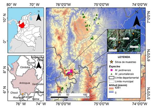 Se realizaron diez visitas de campo a las tres localidades entre febrero y mayo de 2023. Se efectuaron recorridos de 2.2 km en los que se registraron individuos de M. jardinensis y M. yarumalensis encontrados a 10 m de los senderos en fragmentos de bosques, con un área recorrida aproximada de 4.5 ha. Cada individuo fue georreferenciado con un GPS 76CSx marca Garmin® (George Town, Islas Caimán). Se midió el diámetro a la altura del pecho (DAP) utilizando una cinta de fibra de vidrio HFMT8330 marca INGCO® (Suzhou, China) y se estimó la altura total; las variables se registraron en el software Memento database v. 5.1.0 (MementoDB Inc., 2023).