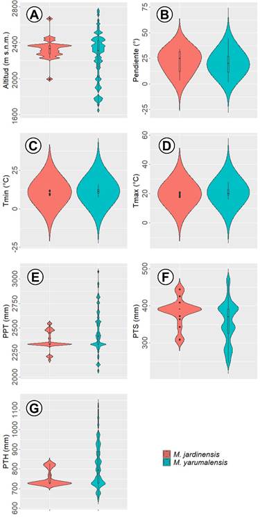 Figura 3: Gráficos de violín de los rangos de las variables ambientales asociadas a la distribución de Magnolia jardinensis M. Serna, C. Velásquez & Cogollo y M. yarumalensis (Lozano) Govaerts. A. altitud; B. pendiente; C. temperatura mínima del mes más frio; D. temperatura máxima del mes más cálido; E. precipitación; F. precipitación del trimestre más seco; G. precipitación del trimestre más húmedo.