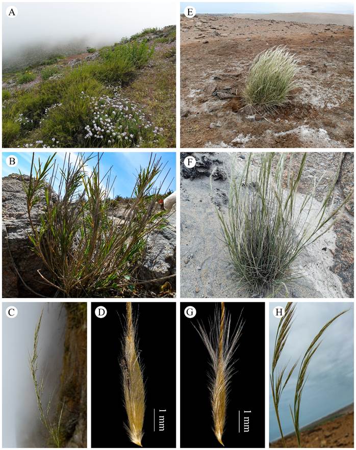 Figura 2: Jarava disticha (Hitchc.) Muñuico & Quip., A. hábitat; B. hábito; C. panícula; D. antecio. Jarava pachypus (Pilg.) Peñail., E. hábitat; F. hábito; G. antecio; H. panícula. Fotografías de Jhon W. Muñuico.