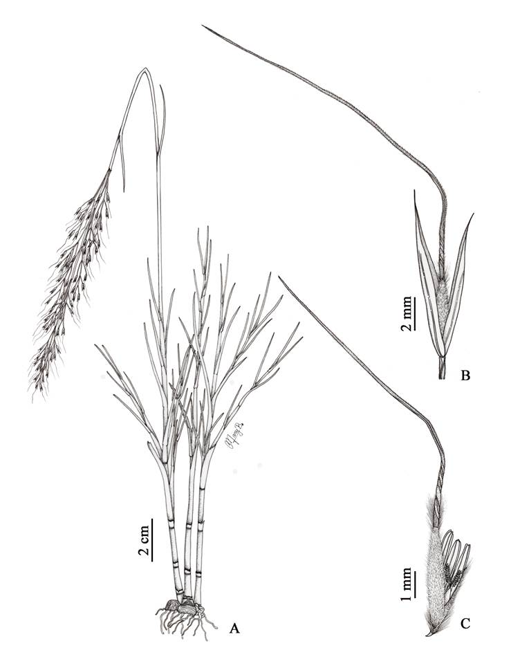 Figura 3: Jarava disticha (Hitchc.) Muñuico & Quip. A. hábito; B. espiguilla; C. antecio. Basado en J. Muñuico y M. Bedoya 874 (HSP). Ilustrado por Maricruz Bedoya.