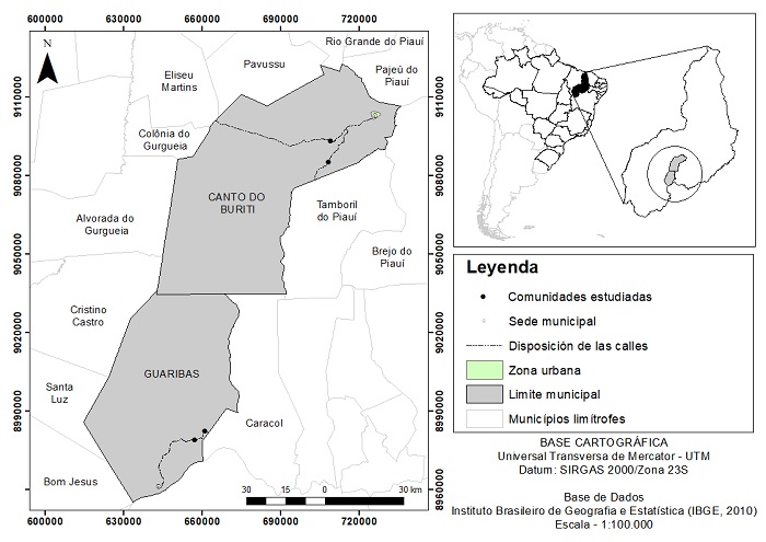La investigación se realizó con habitantes de dos comunidades rurales del municipio Canto do Buriti, Cajazeira (Latitud 707062, 012; Longitud 9083305, 666; Zona 23 S) y Saco (Latitud 706527, 957; Longitud 9093416, 940; Zona 23 S), y dos comunidades del municipio Guaribas, Capim (Latitud 659393, 476; Longitud 8982437, 074; Zona 23 S) y Tamboril (Latitud 657249, 566; Longitud 8980633, 200; Zona 23 S), en la región sur del estado de Piauí, Brasil (Fig. 1). El sistema de coordenadas utilizado para la identificación geográfica fue UTM (Universal Transversal de Mercator).