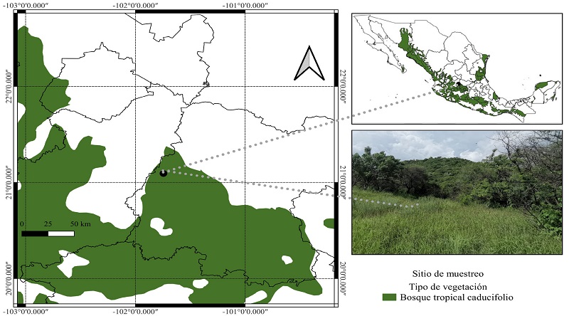 El área de estudio (Fig. 1) corresponde a un bosque tropical caducifolio, ubicado en el municipio León, Guanajuato, México, en las coordenadas 21°05'38.0''N, 101°44'40.0''W a 1830 m s.n.m. El clima es semicálido con temperatura media anual de 18 °C y precipitación media anual de 650 mm (CONAGUA, 2023); el suelo corresponde a un Pelic Vertisol de acuerdo con la clasificación de la International Union of Soil Sciences (IUSS) Working Group WRB (WRB, 2015). La vegetación corresponde a un bosque tropical caducifolio, con mayor presencia de Ipomoea arborescens (Humb. & Bonpl. ex Willd.) G. Don., Mimosa monancistra Benth. e Isolatocereus dumortieri (Scheidw.) Backeb.