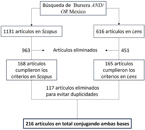 Los términos de búsqueda usados con los operadores booleanos fueron; Bursera AND/OR Mexico (en el título, resumen, palabras clave o en el cuerpo del documento) y NOT chemistry, terpenoids, metabolites y dipertenoids (y sus respectivos términos en español), para eliminar el gran número de publicaciones sobre los metabolitos secundarios y aceites esenciales de las especies del género (DeCarlo et al., 2019), que tienen diversos usos médicos y veterinarios, pero que no son tema de esta revisión. La búsqueda incluyó desde la primera publicación (1965) hasta las publicadas en diciembre de 2022.