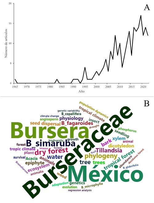 Entre las palabras clave que fueron más usadas por los autores destacan Burseraceae, México (Mexico) y Bursera, seguidas por bosque seco (dry forest), y filogenia (phylogeny), con más de 10 menciones cada una (Fig. 2B). En lo que respecta a las especies, la más mencionada es Bursera simaruba (L.) Sarg., seguida por B. fagaroides (Kunth) Engl., aunque también destacan B. copallifera (Moc. & Sessé) Bullock, B. microphylla A. Gray, y en menor medida B. glabrifolia (Kunth) Engl. Otras palabras clave frecuentes son agua, árbol o árboles, Tillandsia L., bosque tropical, clima tropical, corteza, xilema, dispersión de semillas y otras (Fig. 2B)