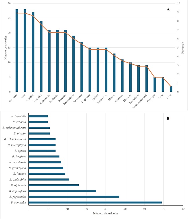 De acuerdo con nuestra clasificación de los artículos por temas, los estudios de composición y estructura de la vegetación y los relativos a los usos de las especies fueron los más abundantes. Hay también un buen número de estudios sobre semillas que incluyen diversos aspectos: ecológicos (como frugivoría y dispersión), anatómico-embriológicos, de viabilidad y de propagación de algunas especies (Fig. 3A).