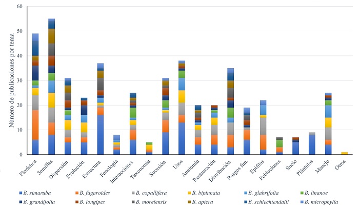 A pesar de que en los artículos revisados se menciona a un gran número de especies, muchas aparecen en solo una o dos publicaciones (se muestra el número de publicaciones que corresponde a cada especie en el Apéndice). Solo 16 especies cuentan con 10 o más publicaciones, y solo cinco tienen más de 20 (Fig. 3B). Destaca nuevamente la gran preeminencia de Bursera simaruba, seguida de lejos por B. fagaroides, y después por B. copallifera, B. bipinnata (Moc. & Sessé ex DC.) Engl. y B. glabrifolia. En cuanto a las especies mencionadas en los distintos temas incluidos en el análisis, B. simaruba se encuentra prácticamente en todos ellos, seguida de cerca por B. fagaroides (Fig. 4). Los estudios de semillas, dispersión, florística, estructura, sucesión, usos, distribución, interacciones y anatomía incluyen entre 10 y 12 especies cada uno, mientras que los de fenología, taxonomía, poblaciones, suelo y plántulas incluyen un número muy bajo de especies; el resto de los temas ocupan un lugar intermedio (Fig. 4).