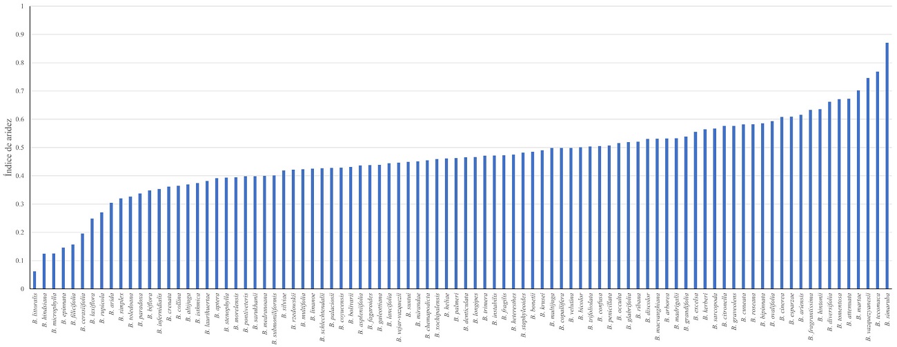El análisis de la distribución de las especies a lo largo del gradiente de aridez permite concluir que hay un grupo importante de especies que se localiza en el extremo más seco de distribución del género, que han recibido muy poca atención, pues solo dos de las 20 especies en la porción más seca del gradiente cuentan con 10 o más menciones, mientras que esta proporción se incrementa en las especies distribuidas en los ambientes relativamente más húmedos. No se conoce con detalle cuales son las adaptaciones específicas (tales como grosor y densidad de la madera, corteza y otros almacenes de agua, y características foliares) que permiten a las especies que se encuentran en el gradiente más árido sobrevivir y crecer. De ellas, solo B. microphylla ha sido objeto de investigaciones al respecto (Roldan-Nicolau et al., 2020). Sin embargo, en general hay un número muy grande de especies que hasta ahora han recibido muy poca atención.