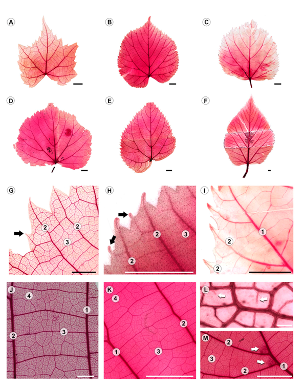 Figure 1: Leaf architecture of Tilia L. A-F. General morphology. A. T. mongolica Maxim.; B. T. platyphyllos Scop.; C. T. oliveri Szyszył.; D. T. cordata Mill.; E. T. endochrysea Hand-Mazz.; F. T. caroliniana subsp. occidentalis (Rose) Pigott; G-I. first and second order (black arrows) teeth, G. T. mongolica Maxim.; H. T. caroliniana subsp. occidentalis (Rose) Pigott; I. T. oliveri Szyszył.; J, K. tertiary veins, J. T. caroliniana subsp. floridana (Small) A.E. Murray; K. T. cordata Mill.; L. well-developed areole with unbranched veinlets (white arrows), T. caroliniana subsp. floridana (Small) A.E. Murray; M. domatia tuft like trichomes (white arrows), T. endochrysea Hand-Mazz. Scale is 5 mm in A-F, H-K, M; 2 mm in G; 100 µm in L; number of vein order = 1, 2, 3, 4.