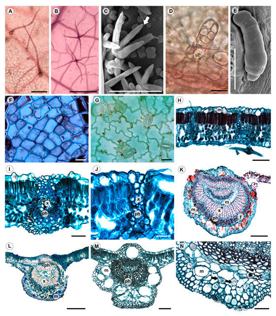 Figure 2: Leaf anatomy of Tilia L. A-E. type of trichomes. A. acicular trichome (cl), T. platyphyllos Scop.; B. stellate trichome with four arms (cl), T. caroliniana subsp. floridana (Small) A.E. Murray; C. fasciculate trichome (white arrow, sem), T. caroliniana subsp. floridana (Small) A.E. Murray; D. bulbose trichome (cl), T. mongolica Maxim.; E. bottle trichome (sem), T. caroliniana subsp. floridana (Small) A.E. Murray; F-J. tissue anatomy. F. adaxial epidermis with straight anticlinal walls (ps), T caroliniana subsp. heterophylla (Vent) Pigott; G. abaxial epidermis with undulate-walled epidermal cells and anomocytic stomata (ps), T. cordata Mill.; H. dorsiventral mesophyll, vascular bundles with extension (cs), T. caroliniana subsp. floridana (Small) A.E. Murray; I, J. detail of vascular bundles with extension (cs); I. T. cordata Mill.; J. T. platyphyllos Scop.; K-M. midvein types (cs); K. type 1, T. caroliniana subsp. floridana (Small) A.E. Murray; L. type 2, T. caroliniana subsp. occidentalis (Rose) Pigott; M. type 3, T. oliveri Szyszył.; N. detail of druses (yellow arrows) and mucilage cavities in midvein (cs), T amurensis Rupr. cl=cleared leaf; ps=paradermal section; sem=scanning electron microscopy; cs=cross section. Scale is 100 µm in A-C, M; 20 µm in D, F, G; 50 µm in E, H-J, N; 300 µm in K, L. f=fibers; m=mucilage; ph=phloem; x=xylem.