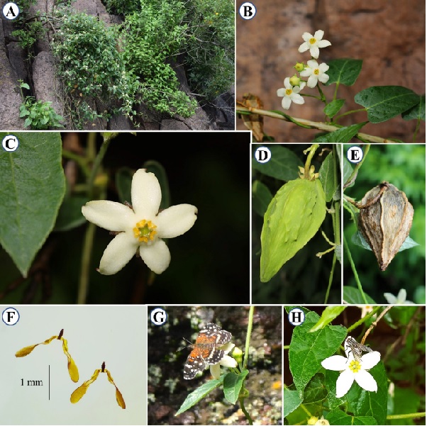 Figura 1: Gonolobus imladrisanthus Pío-León, R.M. Gutiérrez & L.O. Alvarado. A. hábito; B. inflorescencia; C. acercamiento a la flor; D y E. frutos; F. polinarios; G y H. visitantes florales. Créditos fotográficos de Maximiliano Gutiérrez-Sánchez (A, B, D y E) y Fernando Pío-León (C, F-H).