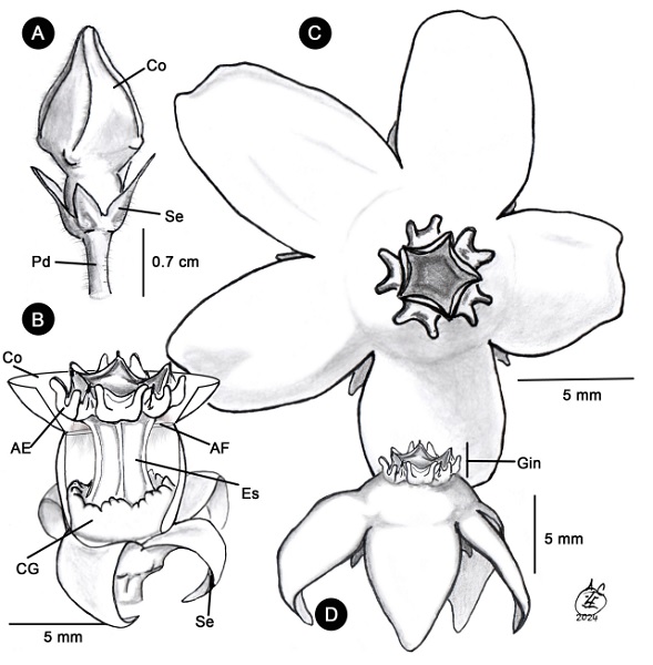 Figura 2: Gonolobus imladrisanthus Pío-León, R.M. Gutiérrez & L.O. Alvarado. A. botón; B. corte de un botón para observar la morfología del ginostegio y su corona ginostegial; C. vista frontal de la flor madura; D. vista lateral de la flor madura donde se observa el limbo, sus lóbulos reflexos y los apéndices dorsales de las anteras con los lóbulos ascendentes. Ilustración de Leonardo O. Alvarado-Cárdenas con base en fotografías y material preservado del ejemplar tipo.