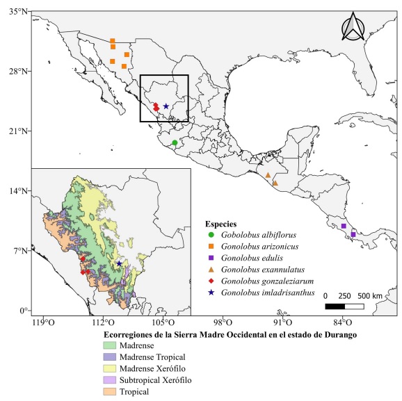 Figura 3: Mapa de distribución de Gonolobus imladrisanthus Pío-León, R.M. Gutiérrez & L.O. Alvarado y las otras especies de Gonolobus Michx. con corolas blancas. El recuadro muestra el detalle de la distribución en las ecorregiones de la Sierra Madre Occidental dentro del estado de Durango.
