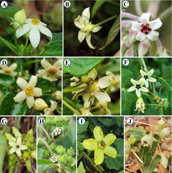 Figura 4: Láminas comparativas entre la nueva especie, otras especies de corola blanca y el resto de las especies conocidas en el estado de Durango. A, B. Gonolobus imladrisanthus Pío-León, R.M. Gutiérrez & L.O. Alvarado; C. Gonolobus albiflorus W.D. Stevens; D, E. Gonolobus edulis Hemsl.; F. Gonolobus arizonicus (A. Gray) Woodson; G. Gonolobus gonzaleziarum Pío-León, Art. Castro & L.O. Alvarado; H. Gonolobus jaliscensis B.L. Rob. & Greenm.; I. Gonolobus erianthus Decne.; J. Gonolobus gonoloboides (Greenm.) Woodson. Créditos fotográficos de A, G, H: Fernando Pío León; B: Maximiliano Gutiérrez Sánchez; C: Julio Álvarez Ruíz (iNaturalistMX, 2022, Foto 123778248® reproducida con autorización de su autor), D, E, I: Carlos Velazco Macias (D, E (iNaturalistMX, 2023b, Foto 192686375, CC BY-NC; I (iNaturalistMX, 2021, Foto 91466179, CC BY-NC) ; F, J: Sue Carnahan (F (iNaturalistMX, 2024a, Foto 198827556, CC BY-NC); J (iNaturalistMX, 2024b, Foto 209854392, CC BY-NC).