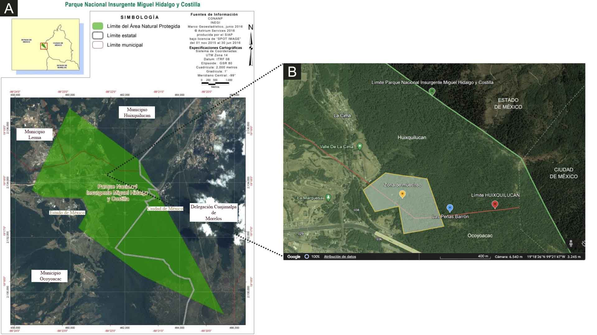 Figura 1: Área de estudio. A. mapa oficial del Parque Nacional Insurgente Miguel Hidalgo y Costilla (Modificado de CONANP, 2019); B. acercamiento a la zona de muestreo ubicada dentro del Parque Nacional Insurgente Miguel Hidalgo y Costilla, en la localidad Las Peñas Barrón, municipios Huixquilucan y Ocoyoacac, Estado de México, México. Elaborado en Google Earth v. 10.41.2.1 (Google Earth, 2023).
