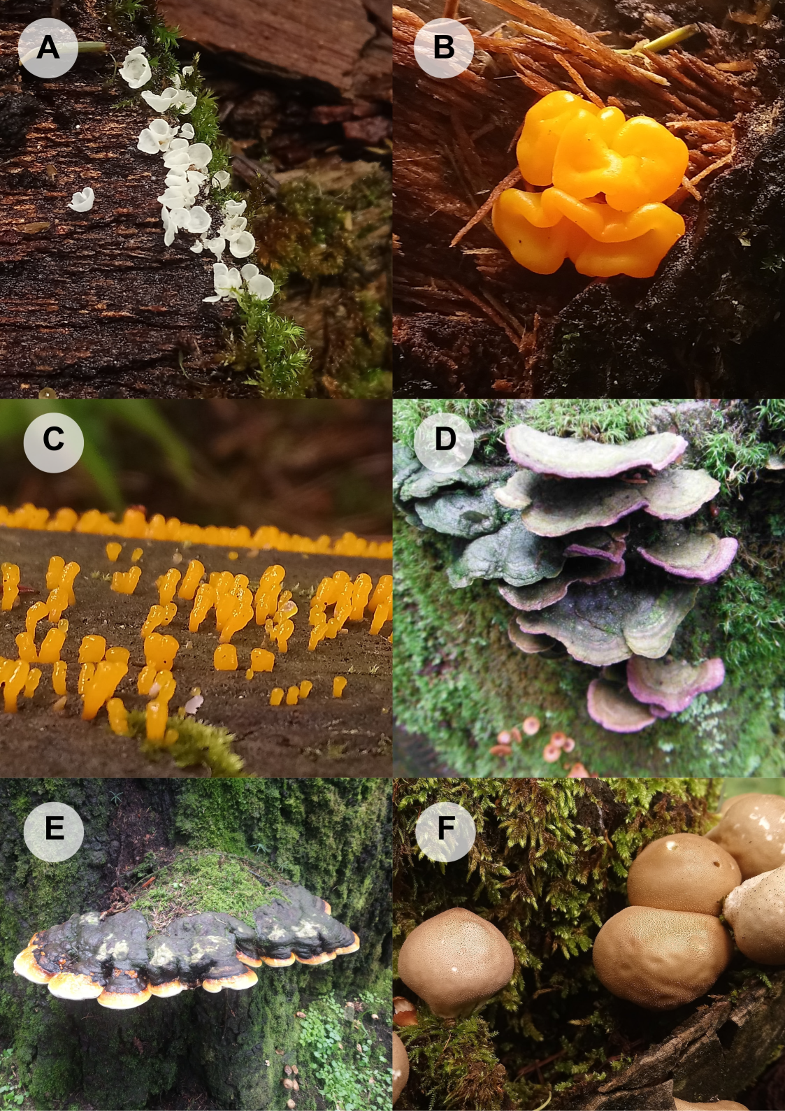 Figura 2: Diversidad de macromicetos degradadores de madera de Abies religiosa (Kunth) Schltdl. & Cham. A. Calyptella sp.; B. Dacrymyces chrysospermus Berk. & M.A. Curtis; C. Heterotextus sp.; D. Trichaptum abietinum (Pers. ex J.F. Gmel.) Ryvarden; E. Fomitopsis pinicola (Sw.) P. Karst.; F. Apioperdon pyriforme Schaeff. Crédito de las fotos: Daniela Guzmán.