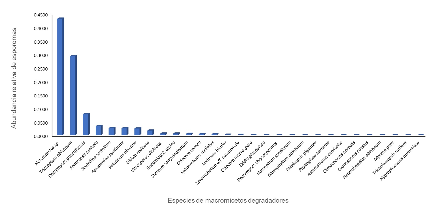 Los taxones más abundantes fueron Heterotextus sp., Trichaptum abietinum (Pers. ex J.F. Gmel.) Ryvarden y Dacrymyces punctiformis Neuhoff. En cuanto a la presencia de hongos por tronco, Fomitopsis pinicola (Sw.) P. Karst. se encuentra en 44 de 100 troncos, seguida de Trichaptum abietinum en 43, Dacrymyces punctiformis en 29 y Heterotextus sp. en 17 (Cuadro 2, Fig. 3).