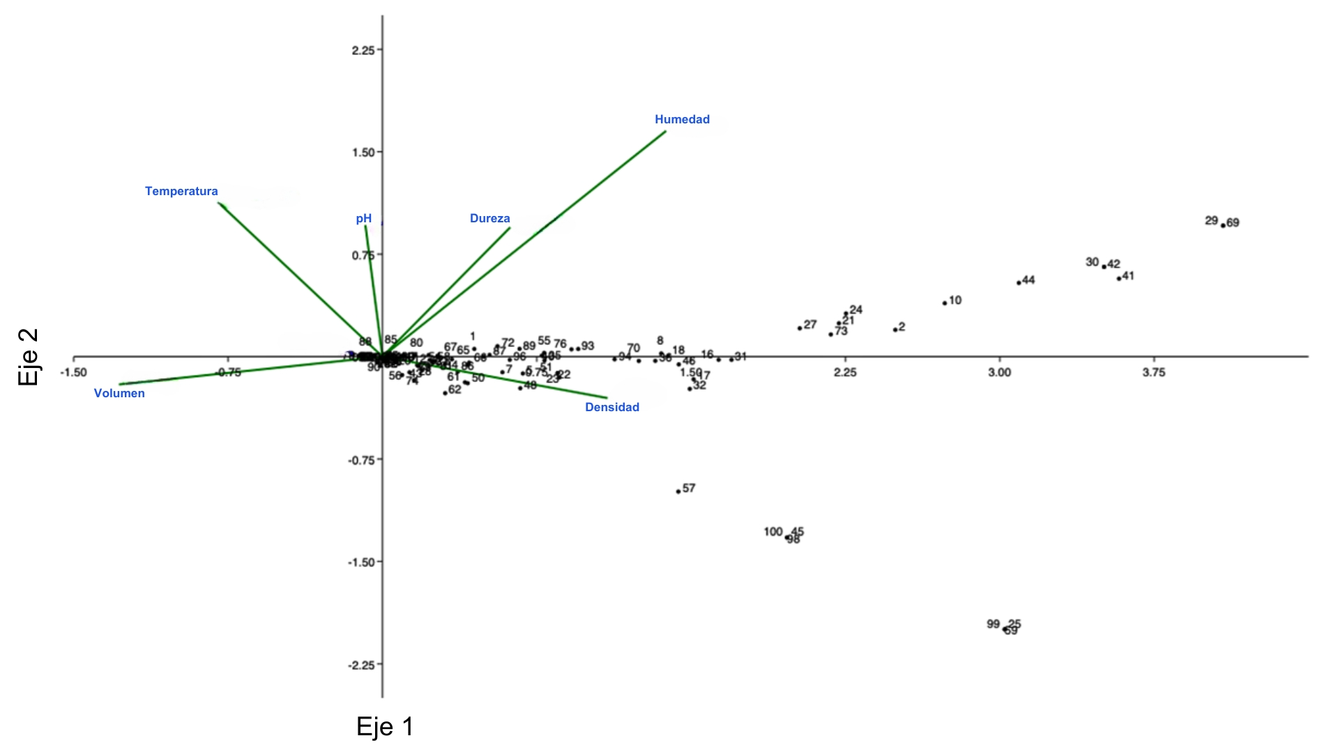La mayoría de los datos de riqueza y diversidad se ubican en los cuadrantes inferior y superior derecho de la Figura 4 del ACC. En ella, la densidad, la humedad y la dureza son las variables que mejor explican el eje 1 y 2. En los cuadrantes mencionados se encontró una mayor densidad, mayor humedad y suavidad.
