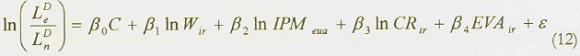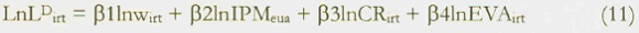 La relación (2) pone en evidencia la interdependencia existente entre las empresas aglomeradas localmente en j, que generan las economías externas que influyen sobre la producción. En este caso, se consideraran las economías de localización internas a la IME de la frontera norte, derivadas del grado de especialización local, EVA, en la generación de valor agregado de la IME y del grado de concentración industrial CR.