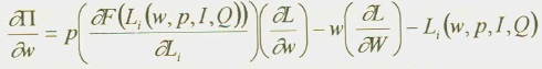 Si recordamos que, de acuerdo con la ecuación (4), las condiciones de primer orden para maximizar la función de beneficio implican que: p∂F(Li(w,p,I,Q)i)/∂Li − w = 0, al sustituir el término en la ecuación (7)4 se observa que la demanda de trabajo está determinada por:
