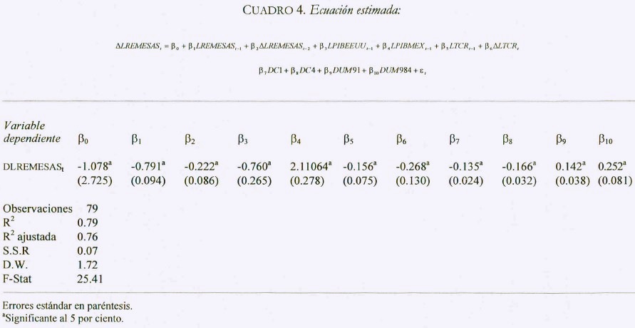 Los coeficientes son significativos y los signos son los que se esperan para los PIB de México y Estados Unidos. En el caso del tipo de cambio real, el argumento que indica un decremento en las remesas en respuesta a una devaluación de la moneda parece ser el más válido. Esto es, la cantidad de recursos en dólares que las familias en México requieren para cubrir sus gastos disminuyen, y con ella, el monto de las remesas. En términos económicos, podríamos interpretar la devaluación de la moneda como un incremento en el ingreso real de los migrantes que radican en Estados Unidos; esto es, con la misma cantidad de dólares que perciben trabajando en el extranjero pueden adquirir un mayor número de bienes en México, o alternativamente, necesitan un menor flujo de remesas para adquirir una canasta de consumo óptima.