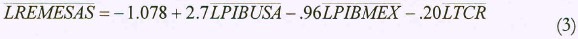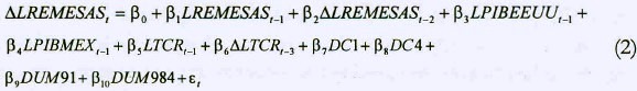 donde los coeficientes de las variables representan las elasticidades de largo plazo. Así pues, podemos establecer que un cambio de un punto porcentual en el pib de Estados Unidos conllevaría a un incremento en el monto de las remesas de 2.7 puntos. Asimismo, si el crecimiento de la economía de México aumentara en un punto porcentual, las remesas disminuirían .96 puntos.