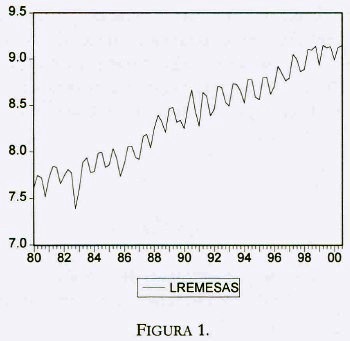 La transformación logarítmica de la serie LREMESAS se presenta en la figura 1. Como se puede observar, la serie presenta una marcada tendencia y periodicidad, por lo que se espera que ésta no sea estacionaria. Para comprobar la sospecha, se realizan las pruebas de raíz unitaria que se describen a continuación.