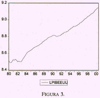 La transformación logarítmica de la serie, LPIBEEUU, se presenta en la figura 3. Los resultados de las pruebas de integración se presentan en el cuadro 1. Similar a lo encontrado en las series consideradas, se concluye que la serie es I(1).7