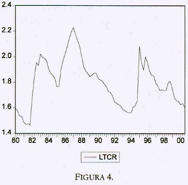 La transformación logarítmica de la serie, LTCR, se presenta en la figura 4. Los resultados de las pruebas de raíz unitaria se presentan en el cuadro 1. En este caso, los resultados no son contundentes. Por una parte, las pruebas DEA y PP con corte estructural sugieren que la sene es I(0). La prueba PP, sin embargo, indica que la serie es I(1). Para el propósito del análisis de cointegración, no obstante, determinar el grado de integración de la serie no es fundamental, ya que Hansen y Juselius (1995) sugieren que para encontrar una relación de cointegración es necesario únicamente que existan dos variables I(1) en el vector considerado; en el caso de las remesas, el PIB de México y el PIB de Estados Unidos son I(1), por lo que esta condición se satisface.