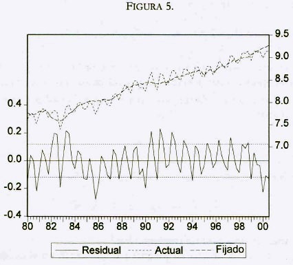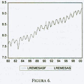 Finalmente, para probar la precisión de la ecuación para realizar pronósticos se efectúa una predicción utilizando la serie en niveles como variable dependiente. La representación gráfica del pronóstico a partir de 1990: 1 se presenta en la figura 6. Como se puede observar, la ecuación reproduce valores de pronóstico muy cercanos a los valores observados.
