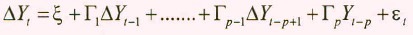 Donde se supone que el término ΔY es un vector I(0) y los (k,1) vectores εt, son independientes y están normalmente distribuidos con varianza constante, Φ. Se asume que existen r relaciones de cointegración, lo cual permite definir la siguiente expresión: