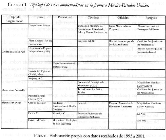 This article attempts to analyze the constitution, classification, objectives, and goals of environmental NGOs along the Mexico-United State border since the passage of NAFTA. Three border cities, Ciudad Juarez, Matamoros, and Tijuana, are taken as a point of departure, Like any other social actor, NGOs experience ongoing change and conflict, continuously modifying their actions and goals. Thus, we try to freeze images from moments during the research in order to detect transformations these social subjects have experienced. Our intention is to show that out of the environmental problems on the Mexico's northern border there has begun to appear a novel, dynamic, and bold social organization that must also confront old structures and politics tooted in daily practices.