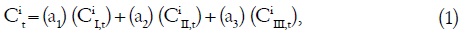 donde Cit es el coeficiente del FGP de la entidad i para el período t, CiI,t corresponde al coeficiente parcial de la entidad para la primera parte, CiII,t es el coeficiente parcial de la segunda parte y CiIII, t es el coeficiente parcial de la tercera parte. Los parámetros a1, a2 y a3, que suman uno, son los ponderadores de cada coeficiente parcial. El artículo 2 de la Ley de coordinaciónfiscal establece que los valores de estos ponderadores son:a1 = a2 = 45.17% y a3 = 9.66%.