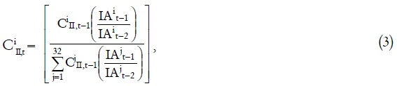 donde CiII, t-1 es el coeficiente parcial de la segunda parte del período anterior, IAit-1 es el monto de los impuestos asignables de la entidad i en el período anterior y IAit-2 es el que corresponde a los impuestos asignables de la entidad i rezagados dos períodos. El denominador de la expresión es el resultado de la suma de numeradores para las 32 entidades. De esta forma, el coeficiente parcial de la segunda parte toma en cuenta la dinámica de los impuestos asignables, ajustada por el coeficiente parcial del período anterior.