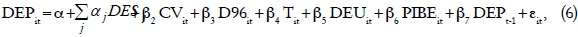 En este artículo incorporo como variables dependientes el producto interno bruto estatal10 (PIBE) en términos reales, la concentración vertical del ingreso fiscal en cada estado (CV), una variable dicotómica para cuantificar el efecto del aumento en la integración del FGP a partir de 1996 (D96), el monto recibido por concepto de transferencias (T) diferentes a las participaciones federales, el monto de la deuda pública estatal y municipal (DEU), otra variable dicotómica para identificar a las entidades fronterizas de las no fronterizas (DF) y el grado de dependencia rezagada durante un período (DEPt-1).