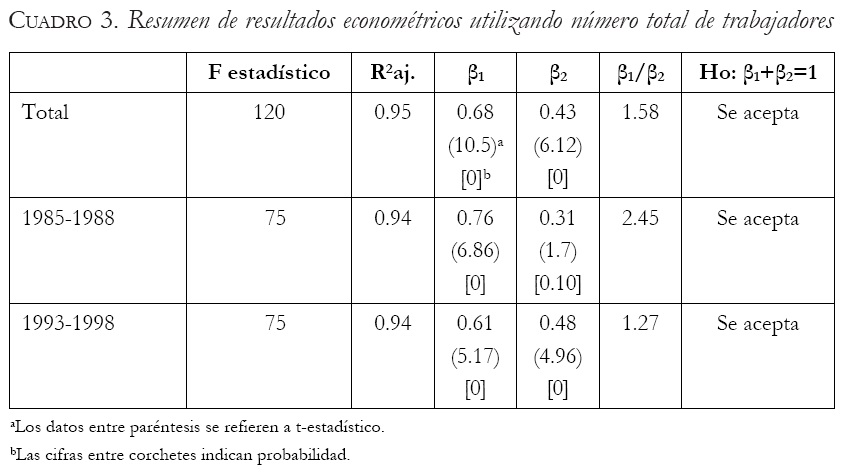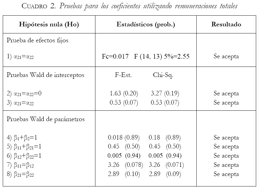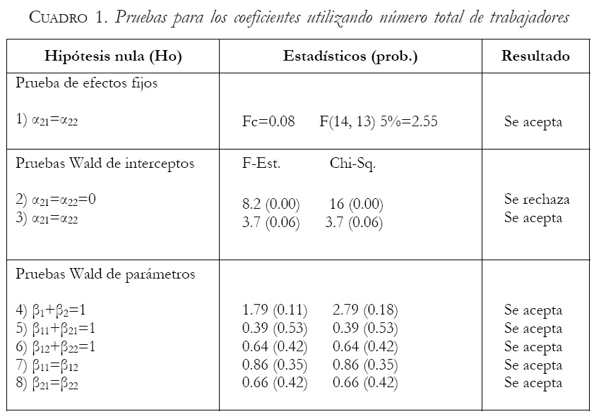 Sin embargo, este resultado no es definitivo, pues se requiere probarlo estadísticamente. Las pruebas Wald 7 y 8, presentadas en los cuadros 1 y 2 bajo la hipótesis nula de que los coeficientes del capital y del trabajo para los dos períodos son iguales, en ambos casos apoyan esta hipótesis. De esta forma, los resultados econométricos demuestran que no existen diferencias en los coeficientes de un período en comparación con el otro.