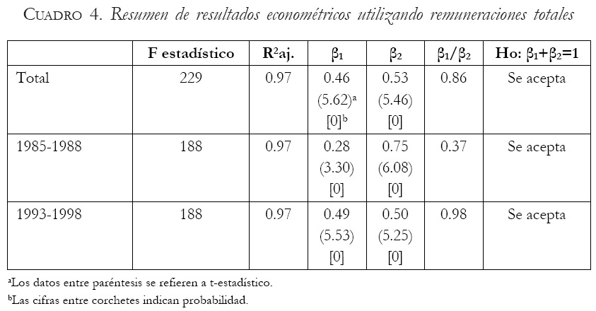 Los resultados de las regresiones para los coeficientes asociados a los factores capital y trabajo para los modelos que utilizan T y R se resumen en los cuadros 3 y 4, respectivamente, en los que se pueden observar los valores de los coeficientes tanto para el período completo 1985-1998, como para sus subperíodos 1985-1988 y 1993-1998. En todos los casos, se acepta la hipótesis de que la suma de los coeficientes es igual a 1, como reportan las pruebas de la 4 a la 6 en los cuadros 1 y 2, lo que es indicativo de homogeneidad lineal en la función estimada. En general, los resultados al utilizar T como en el cuadro 3, indican una mayor intensidad del factor capital, pues la relación (β1/β2) es mayor que 1, mientras que aquellos que emplean la proxy R dan un mayor peso al factor trabajo pues esta relación es mayor que 1. Aparentemente, existen diferencias en el tamaño de los coeficientes de un período a otro cuando se utiliza cualquiera de las proxis para el factor trabajo. De hecho, para el modelo con T, el peso del factor capital se reduce y el del trabajo se incrementa, como se ilustra en el cuadro 3. Inversamente a este resultado, el peso del factor capital se incrementa y el del factor trabajador se reduce en el modelo con R. Esto sería indicativo de que, en cualquiera de los casos, la situación de uno de los grupos, ya sea empresarios o trabajadores, se ve perjudicada al pasar de un período a otro.